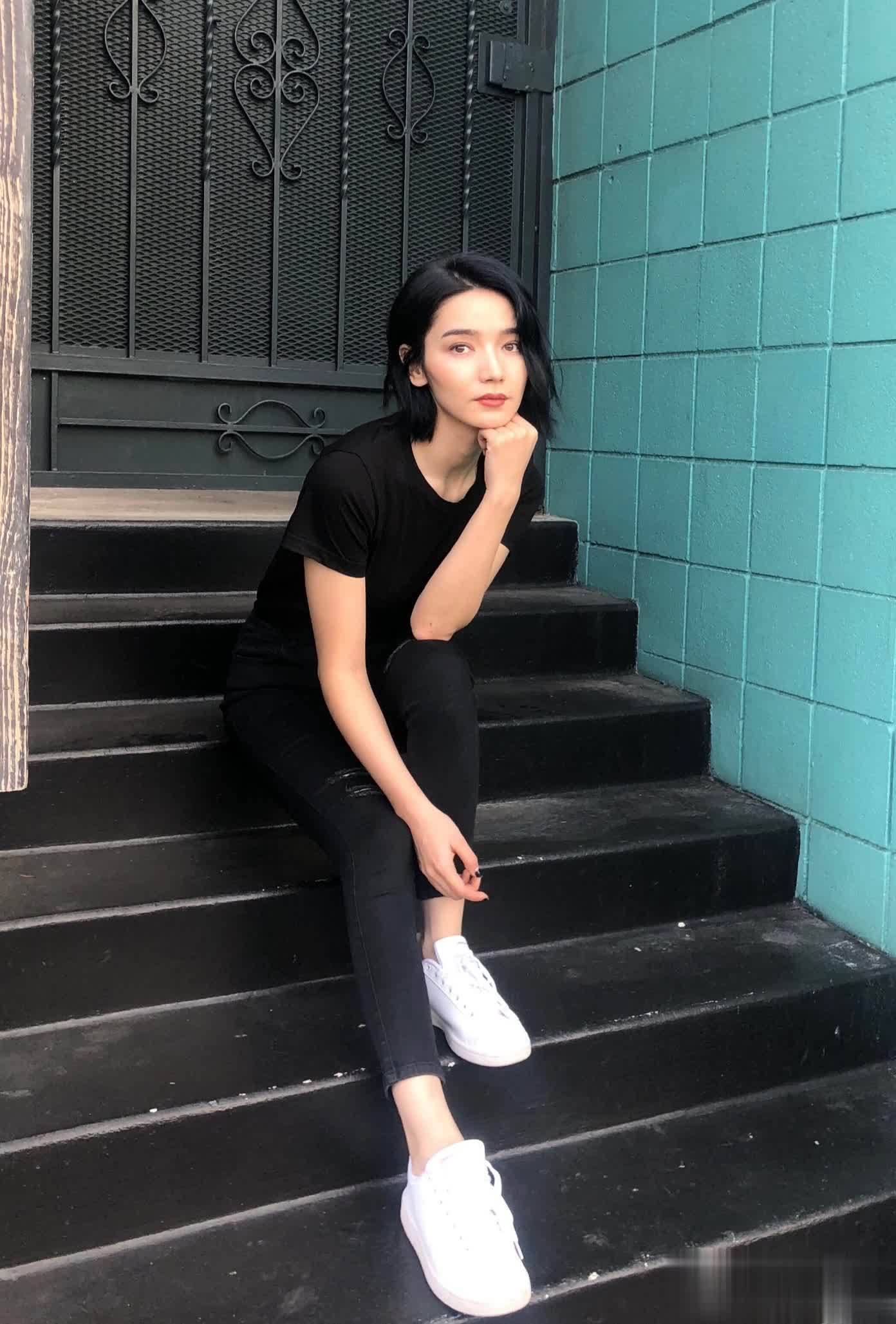 一身黑色服装搭配小白鞋,构成经典黑白配,简约却极具吸引力。修身的黑色牛仔裤,不仅显瘦,还完美展现出纤细美腿,女孩们看了想必都会心生羡慕吧?