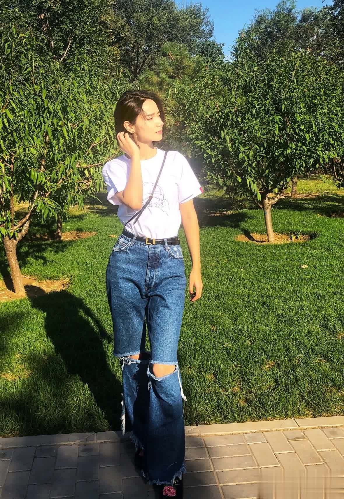 除了修身牛仔裤,宽松版型的牛仔裤也颇为好看,且高腰设计具有显高效果,能够拉长身材比例,搭配白色T恤就十分美观。