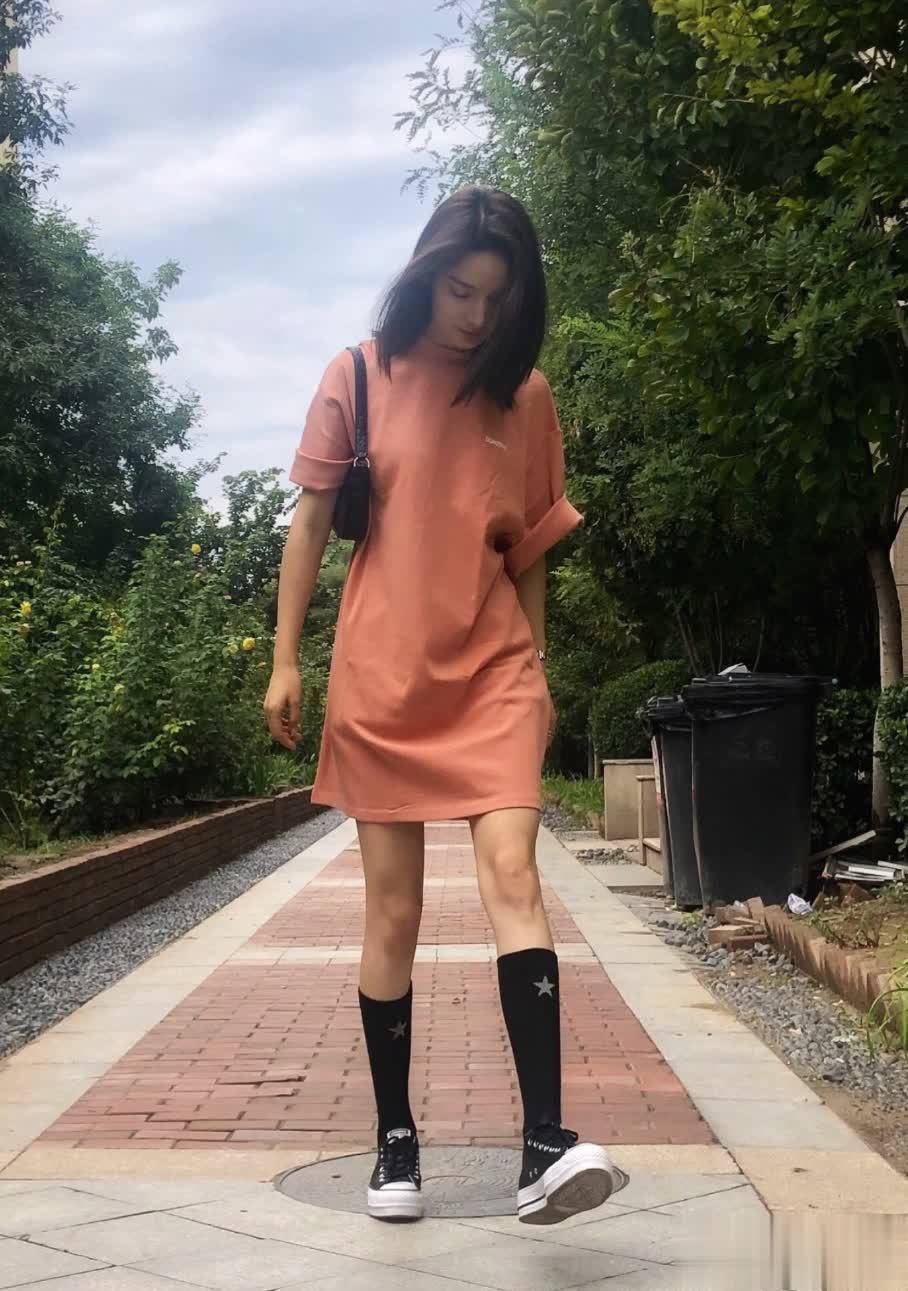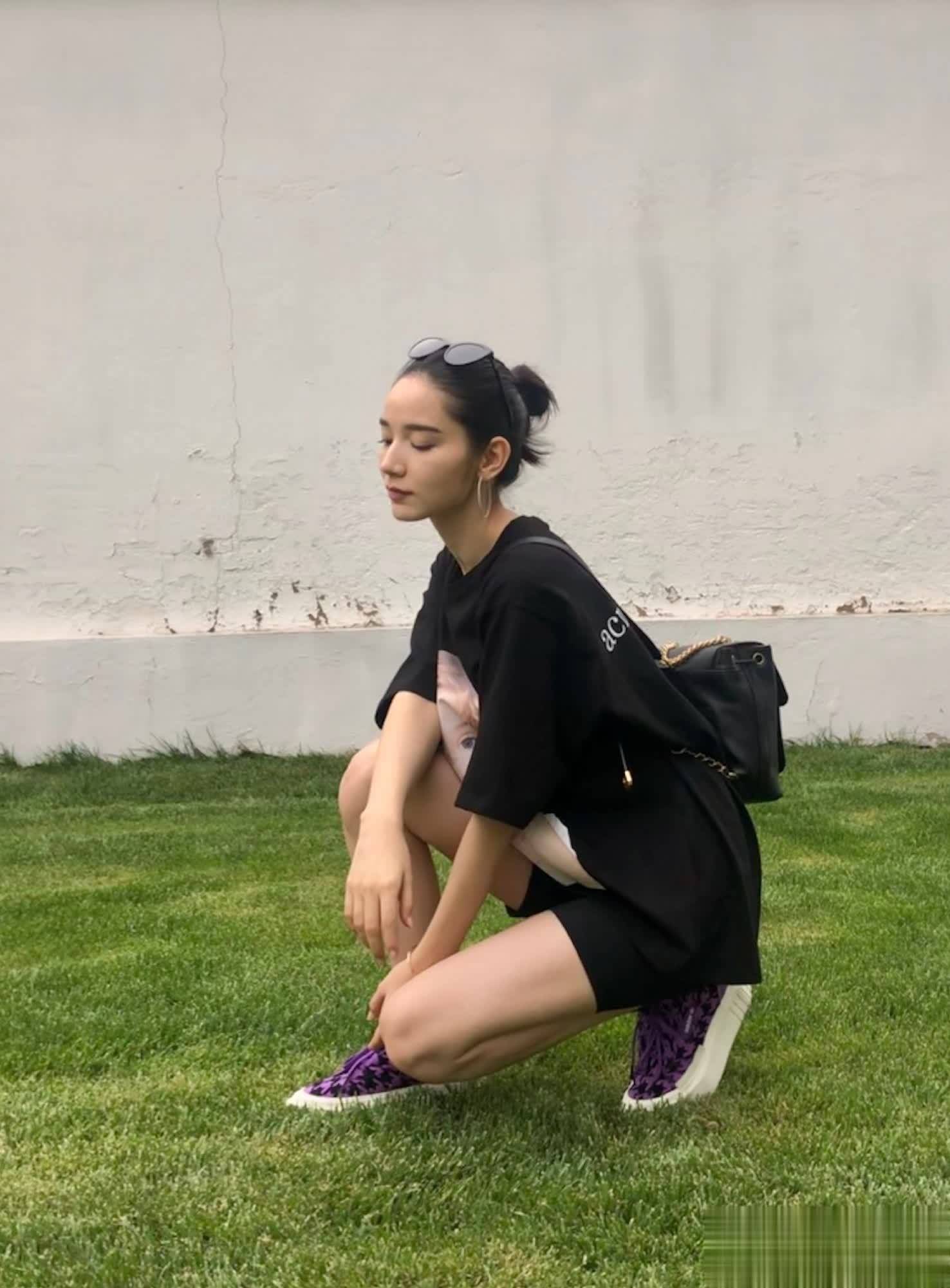 当她束起头发,更显清爽青春,精致五官尽显,搭配黑色墨镜,增添几分个性帅气。一条黑色T恤连衣裙,版型休闲,搭配紫色鞋子,为单调的黑色增添了趣味。这身穿搭个性十足,小编尤为喜爱,既凸显了个性,又尽显身材纤细。